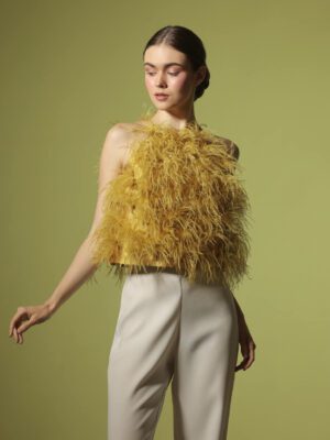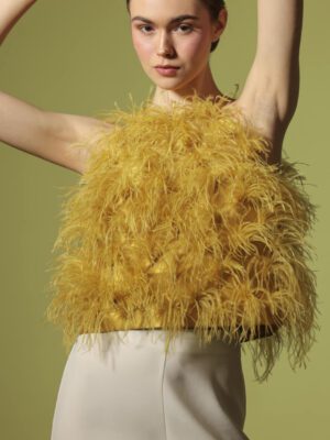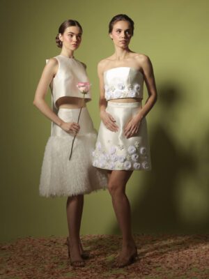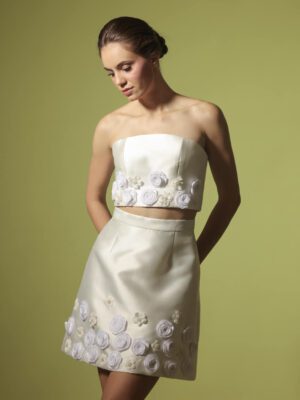 White Mikado silk coordinated corseted bustier cropped top with mini A-line skirt embellished with rosettes
