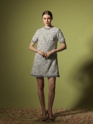 Black and white tweed shift mini dress with short sleeves with trimmings and embellished with crystals bows