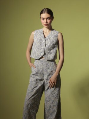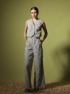 Wine floral embroidered coordinated corseted cropped top with trimmings as straps and full bias cut skirt with secret side pockets