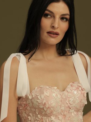 Blush pink and ivory floral lace corseted long gown with full bias cut skirt with white bows as straps