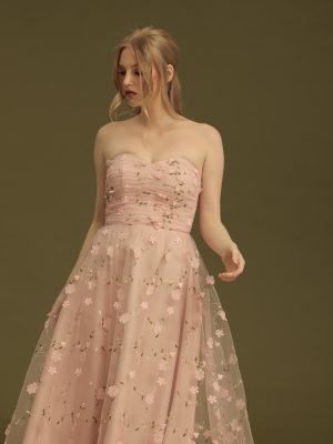 Dusty blue and cream 3D floral tulle long gown with corseted sweet heart neckline bodice and full bias cut skirt