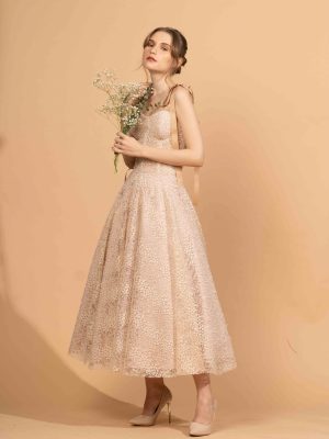- Ivory cocktail textured tulle midi dress