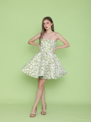 Blush pink silk gazar corseted bustier mini dress embellished with 3d floral appliques with detachable sheer skirt in tulle