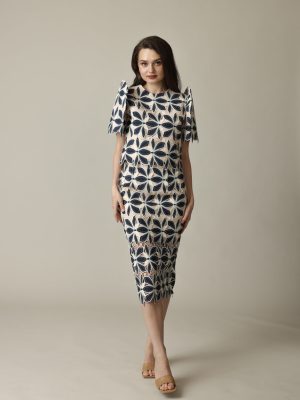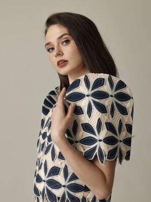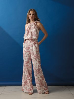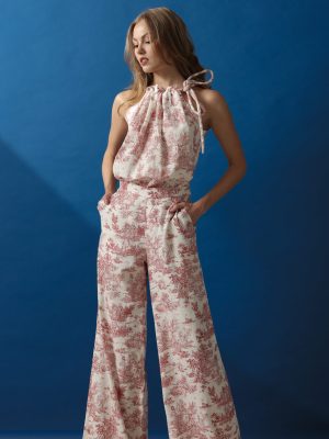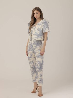 Blue and white toile du jouy coordinated tube top, tailored trousers and modern Filipiniana cover up with butterfly sleeves