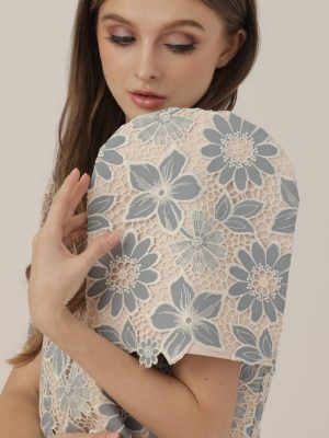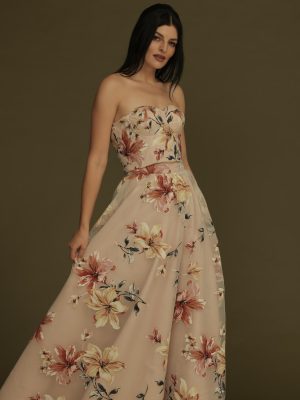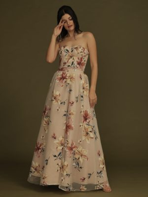 Cream, rust and mocha floral silk organdy coordinated corseted bustier and full bias floor length skirt