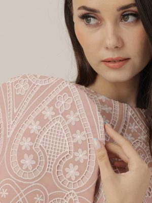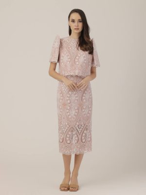 Black fully beaded coordinated corseted bustier cropped top with mini A-line skirt embellished with fuchsia 3D lace appliques
