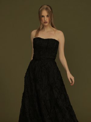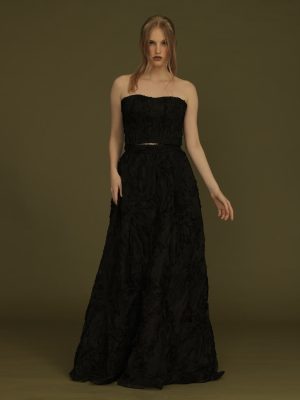 Black textured coordinated corseted bustier cropped top with full bias cut floor length skirt with secret side pockets