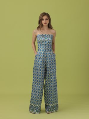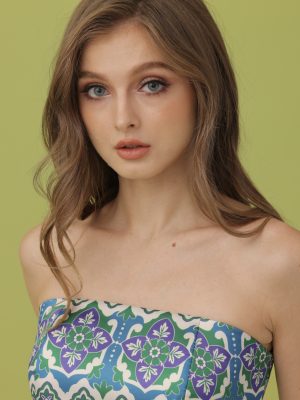 White eyelet corseted tube top with floral trimmings with coordinated pencil cut midi skirt with sheer detail