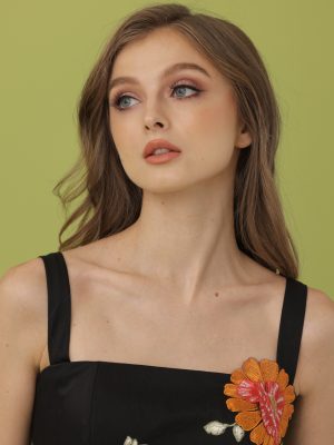 Black cropped corseted tube top with coordinated full bias cut midi skirt embellished with multi-coloured floral lace appliques