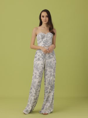 Grey and pink toile du jouy coordinated haltered top with bow detail at the back and wide leg pants with secret side pockets