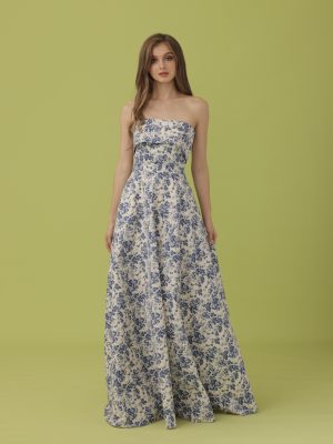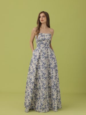 Blue and ivory floral coordinated corseted tube top with flap detail with full bias cut skirt with secret side pockets