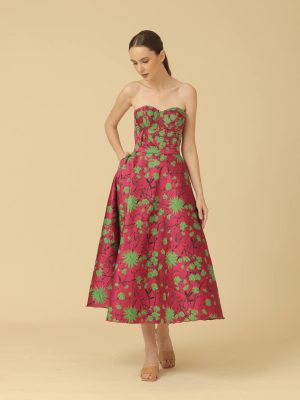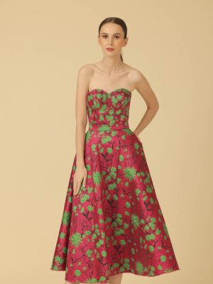 Fuchsia floral silk brocade coordinated corseted top with bias cut midi skirt with secret side pockets