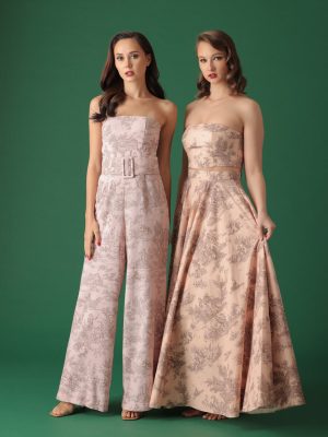 Blush embellished coordinated semi-haltered top with floral crystals on the neckline and pencil cut midi skirt