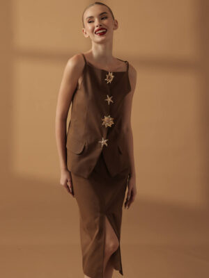 Camel brown denim coordinated tailored top with gold floral buttons and pencil cut midi skirt with center front slit