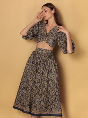 Teal blue floral printed Indian hand blocked cotton coordinated cropped ruched top with puff sleeves and full bias gathered midi length skirt with secret side pockets