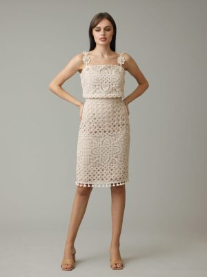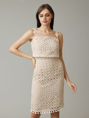 Sand floral crochet coordinate top with trimmings as strap and pencil mini skirt with tassel details