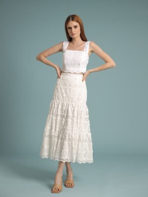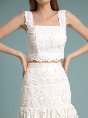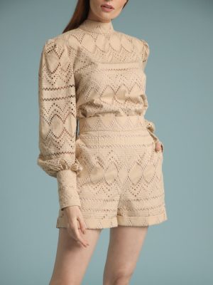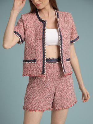 Coordinated yellow tweed in sleeveless top with fringes and floral embroidery and shorts with pockets