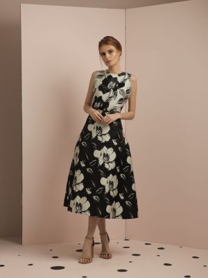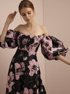 Coordinated top and skirt in pink and black floral silk brocade; tube top with off shoulder puff sleeves; full bias skirt with secret side pockets