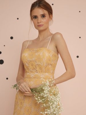 Floral and houndstooth print silk brocade coordinated bustier peplum top and skirt with piping and center front slit