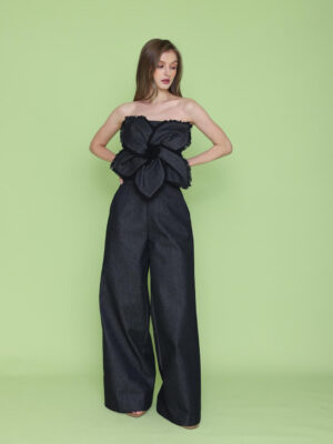 Blush pink silk coordinated corseted bustier statement top with flower petals in organdy and straight cut pants