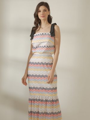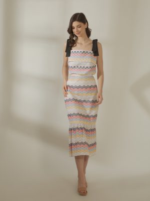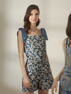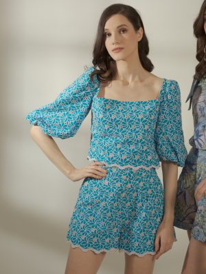 Blue and white Houndstooth with rosette printed silk brocade coordinated top with trimmings and shorts with pockets