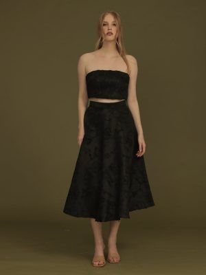 Black floral textured coordinated corseted cropped top with bias cut midi skirt with secret side pockets
