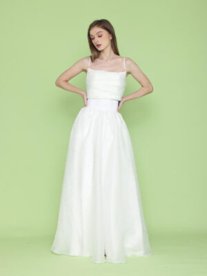 White silk organdy embellished with pearls corseted cowl neck top with full bias cut skirt with secret side pockets
