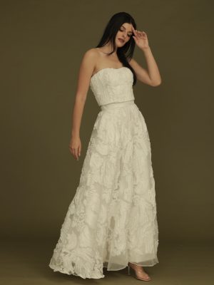 Cream floral 3D textured coordinated corseted cropped top with straps and full bias cut floor length skirt