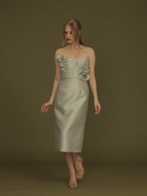 Silver grey silk corseted bustier top embellished with floral lace appliques and faux ostrich feathers