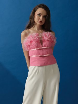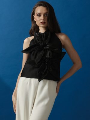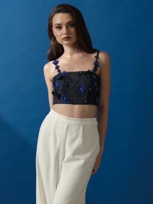 Midnight blue silk cropped top with spaghetti straps embellished with 3D floral details with cut beads and glass beads