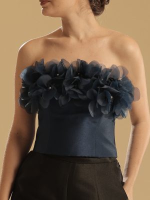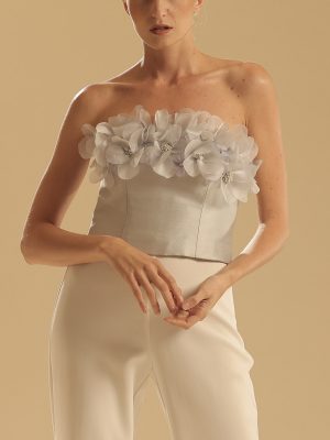 Silver grey pleated silk organdy corseted top with puff sleeves that you can wear on or off the shoulder