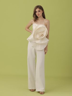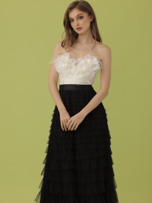 White silk corseted tube top with spaghetti straps embellished with floral 3D lace appliques and crystals