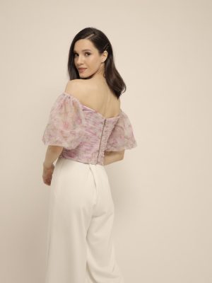 Off shoulder with puff sleeves top in floral lilac soft tulle