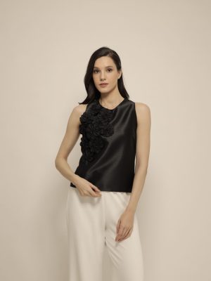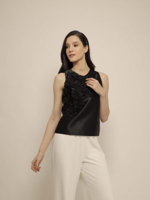 Semi halter black silk top with floral 3D appliques