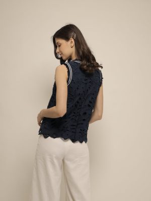 Semi halter navy eyelet top with trimmings