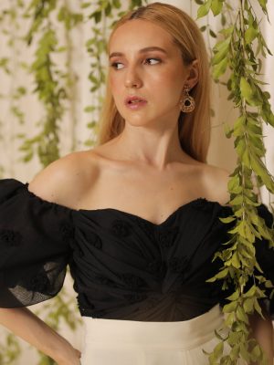 Black bustier top with exaggerated floral laser cut detail in silk