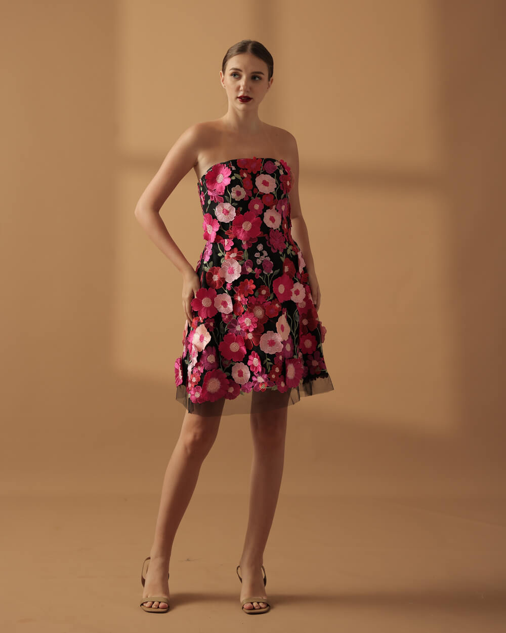 Tags: A Line, Black, Bustier, Cocktail Dress, Corset, Fall 2025, Floral, Fuchsia dress, Mini Dress, Pink