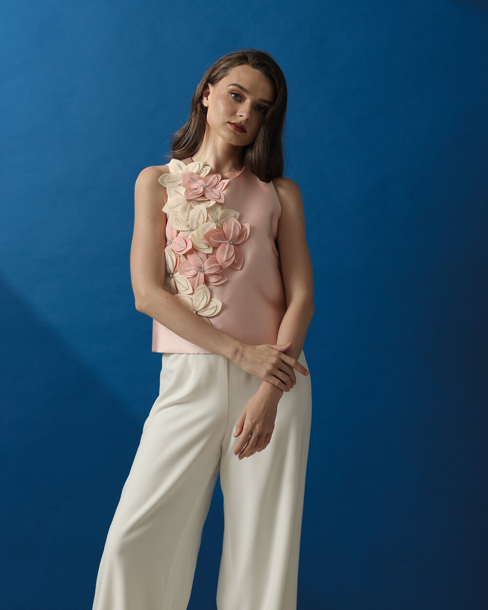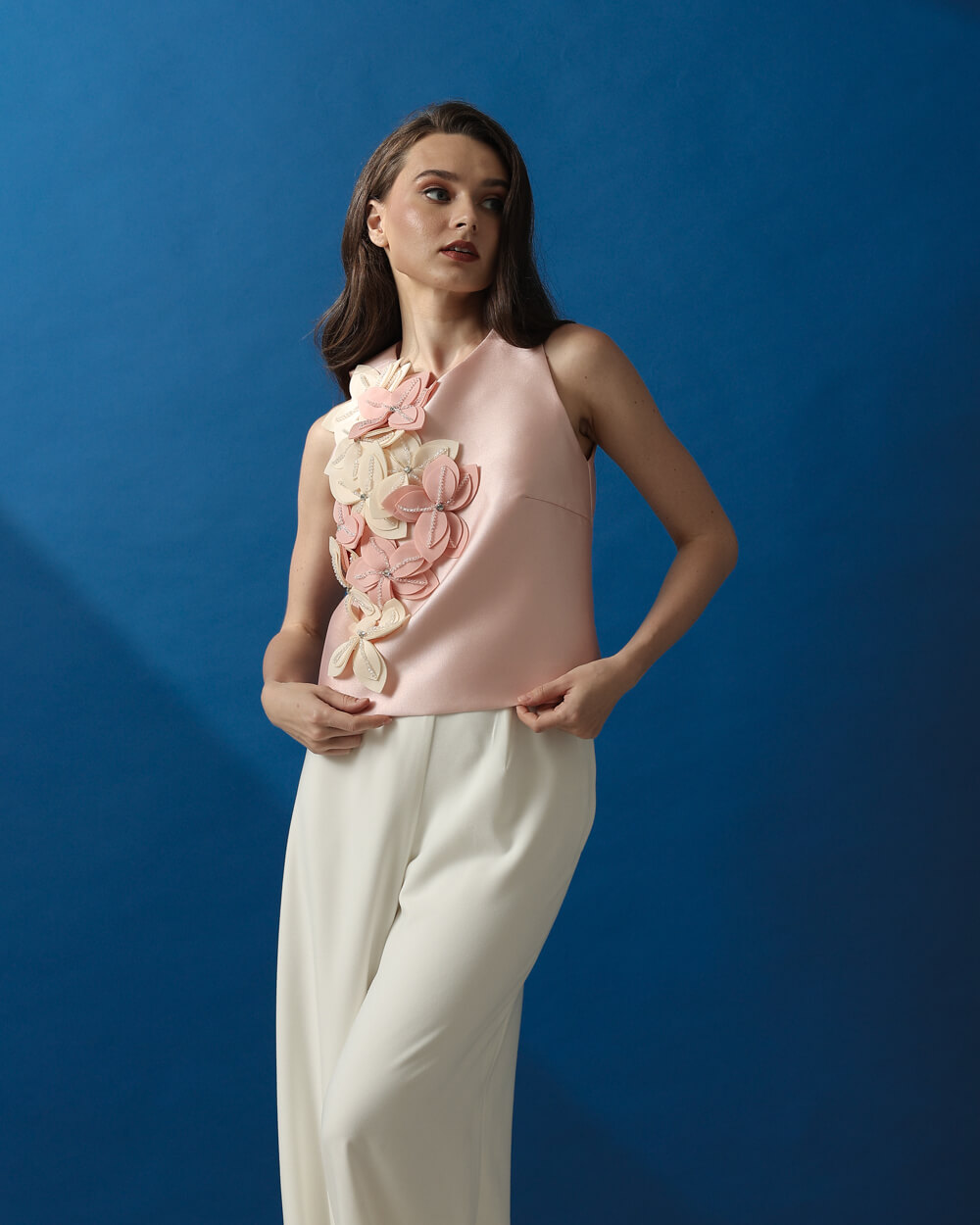Blush pink Mikado silk semi-haltered top embellished with 2-toned floral embellishments