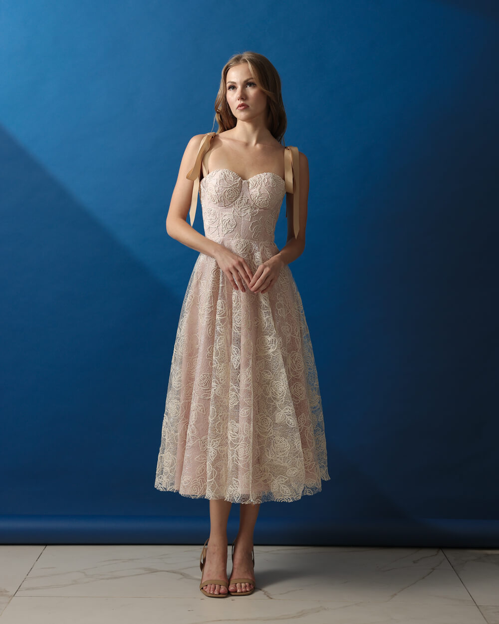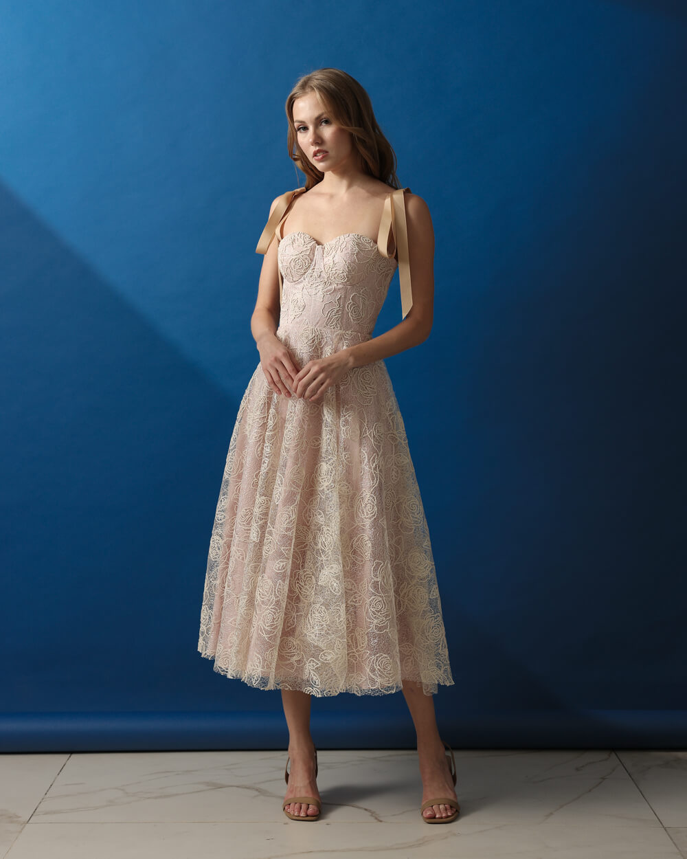 Cream floral lace corseted midi dress with bias cut skirt and bows as straps