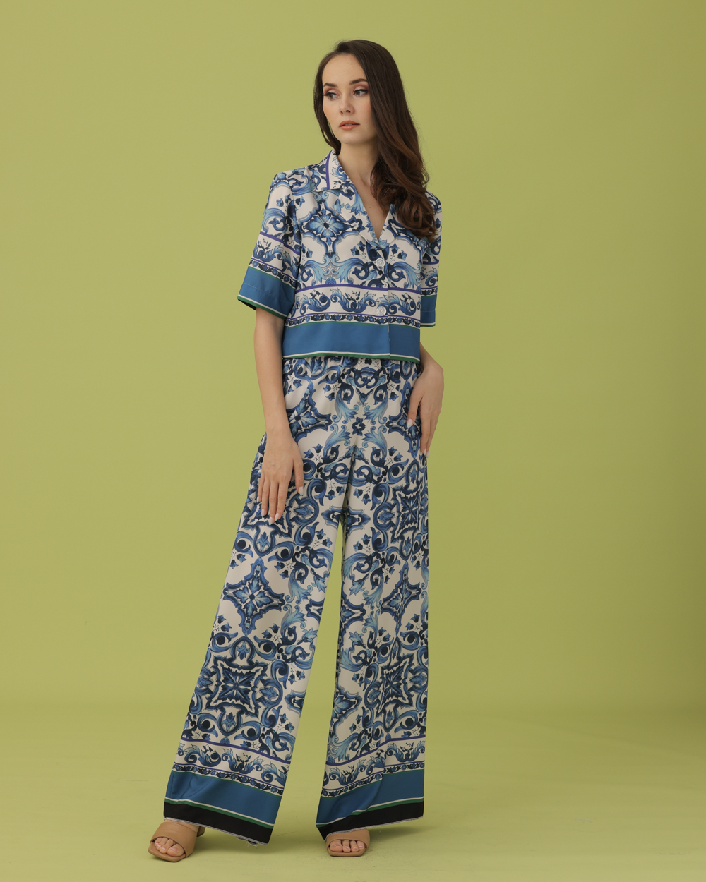 Tags: Blue, Button Down Top, Coordinates, Coords, Cropped top, Holiday 2023, Holiday Collection, Printed, Printed Silk, Silk, Top and pants, Wide Leg Pants