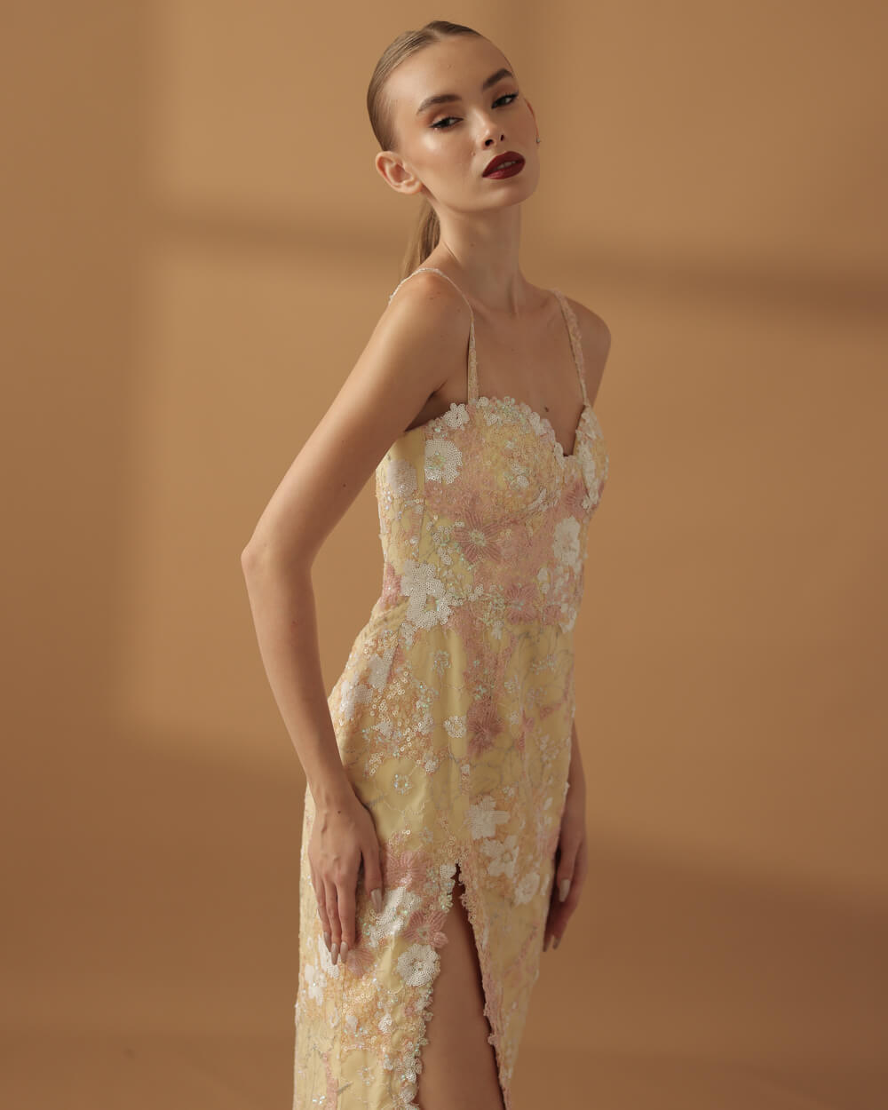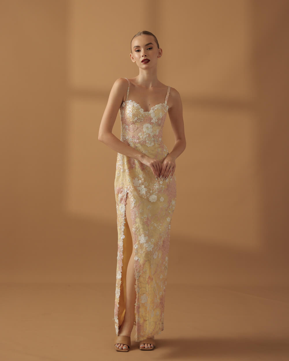 Butter yellow, pink and ivory floral embellished corseted long gown with straps and side slit