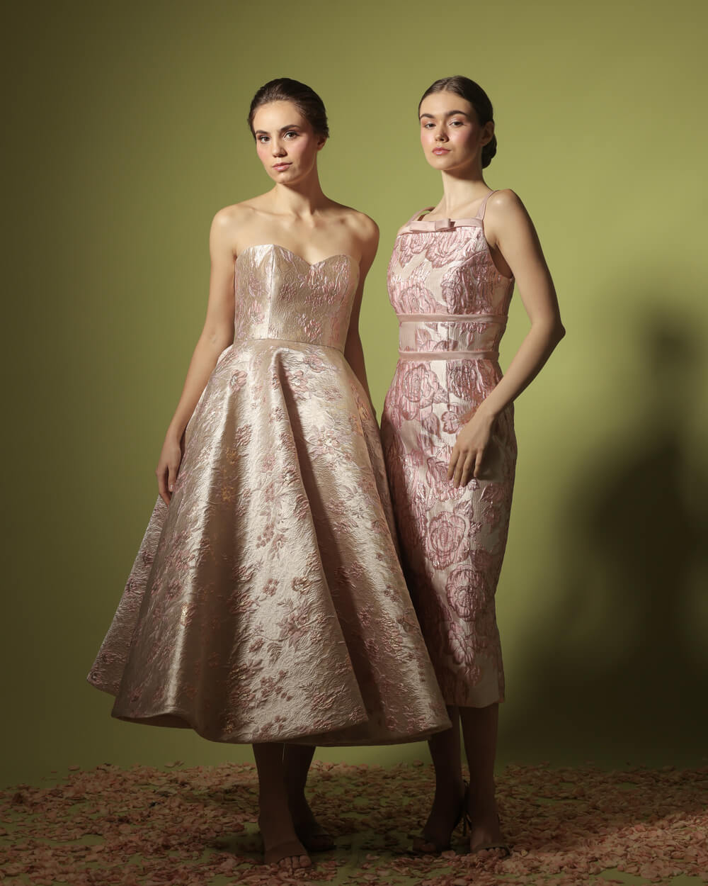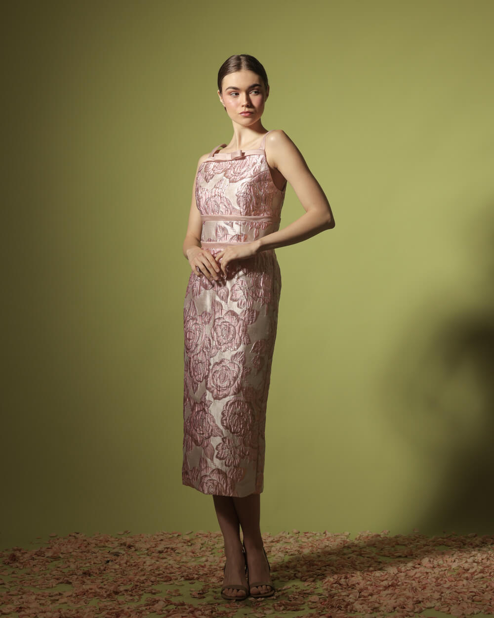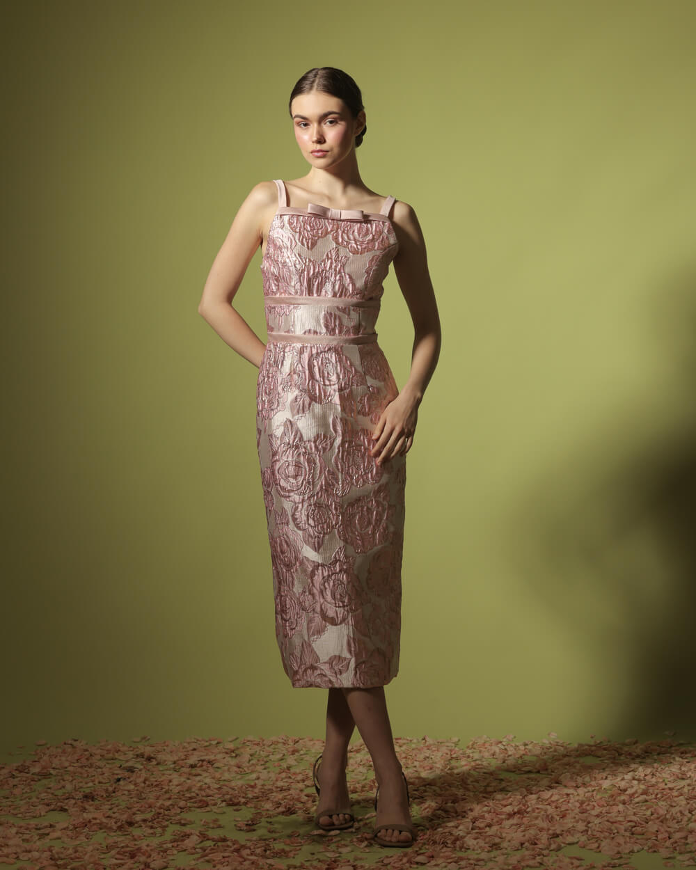 Tags: Bows, Cocktail Dress, Floral, Midi Dress, Pencil cut skirt, Pink, Rosette, Silk, Silk Brocade, Spring Summer 2026, SS2026