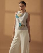 Silver Mikado silk semi-haltered top embellished with 3d floral appliques with beads