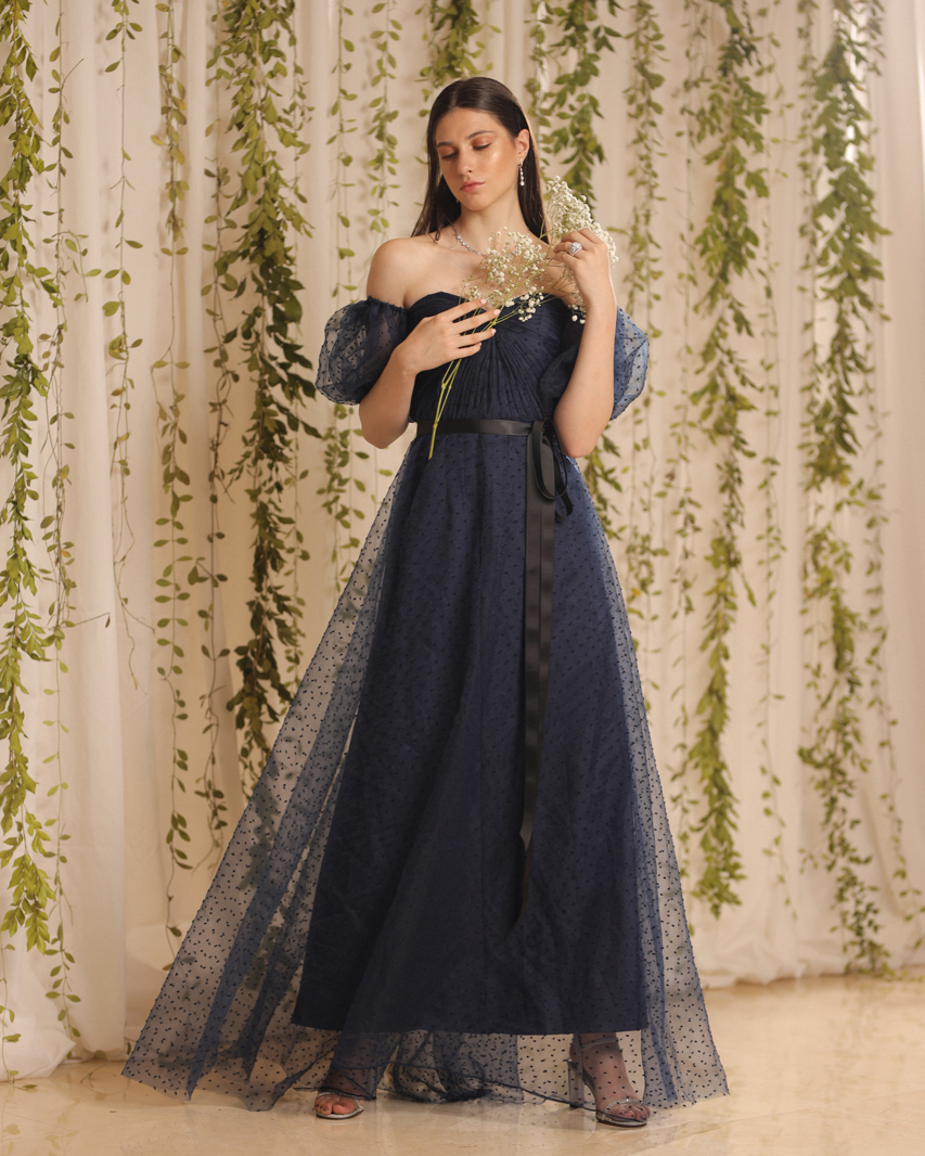 Tags: Gown, Holiday Collection, Midnight Blue, Off shoulder, Puff Sleeves