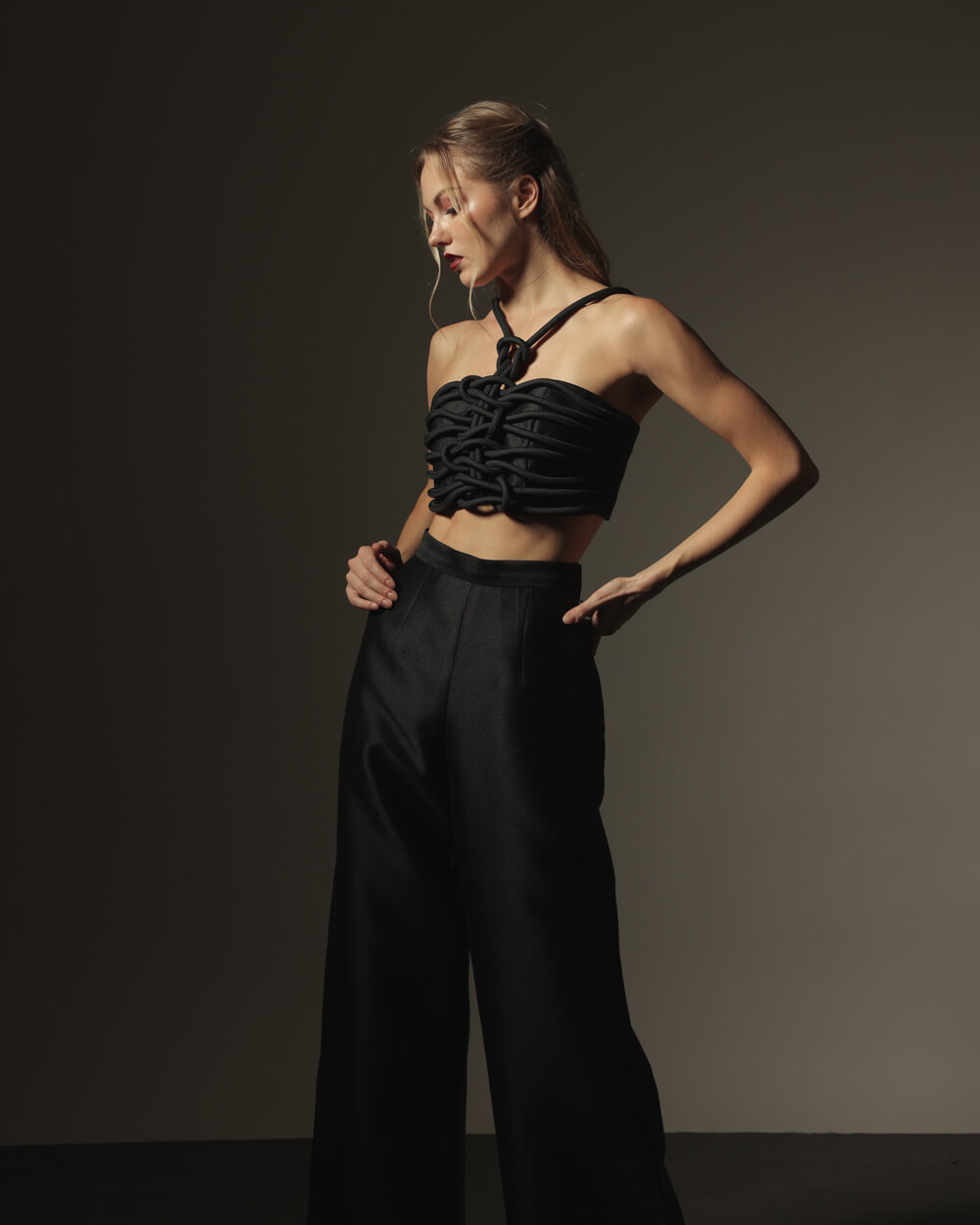 Black silk textured corseted cropped top with haltered straps