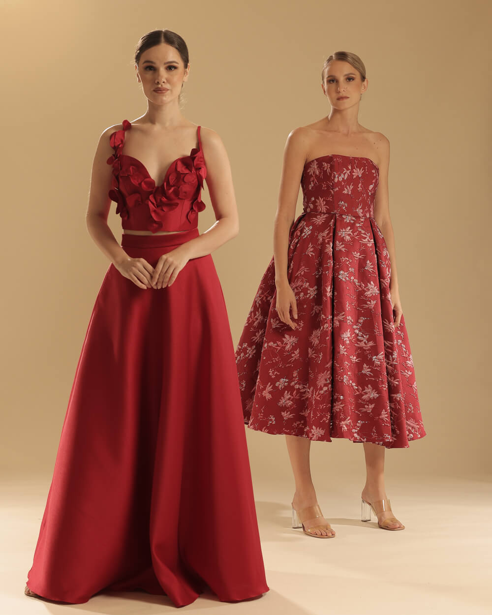 Tags: 3D, Appliques, Bias cut skirt, Burgundy, Coordinates, Coords, Cropped top, Floor length skirt, Floral, Laser Cut, Silk, Spring Summer 2024, SS2024