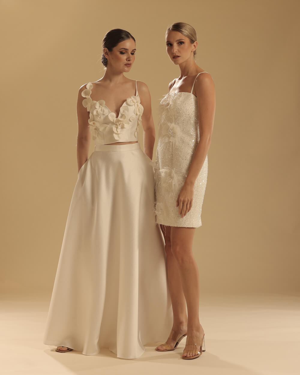 White silk cropped top with floral laser cut 3D appliques