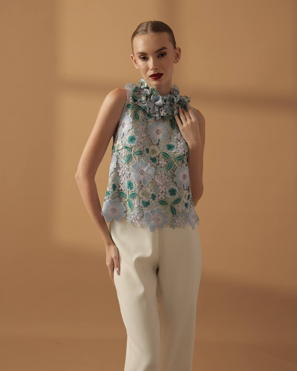 Tags: Dusty Blue, Fall 2025, Floral, Flowers, Guipure lace, Lilac, Semi Halter, Teal