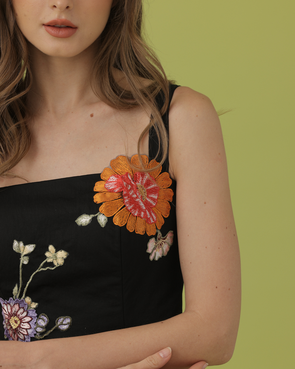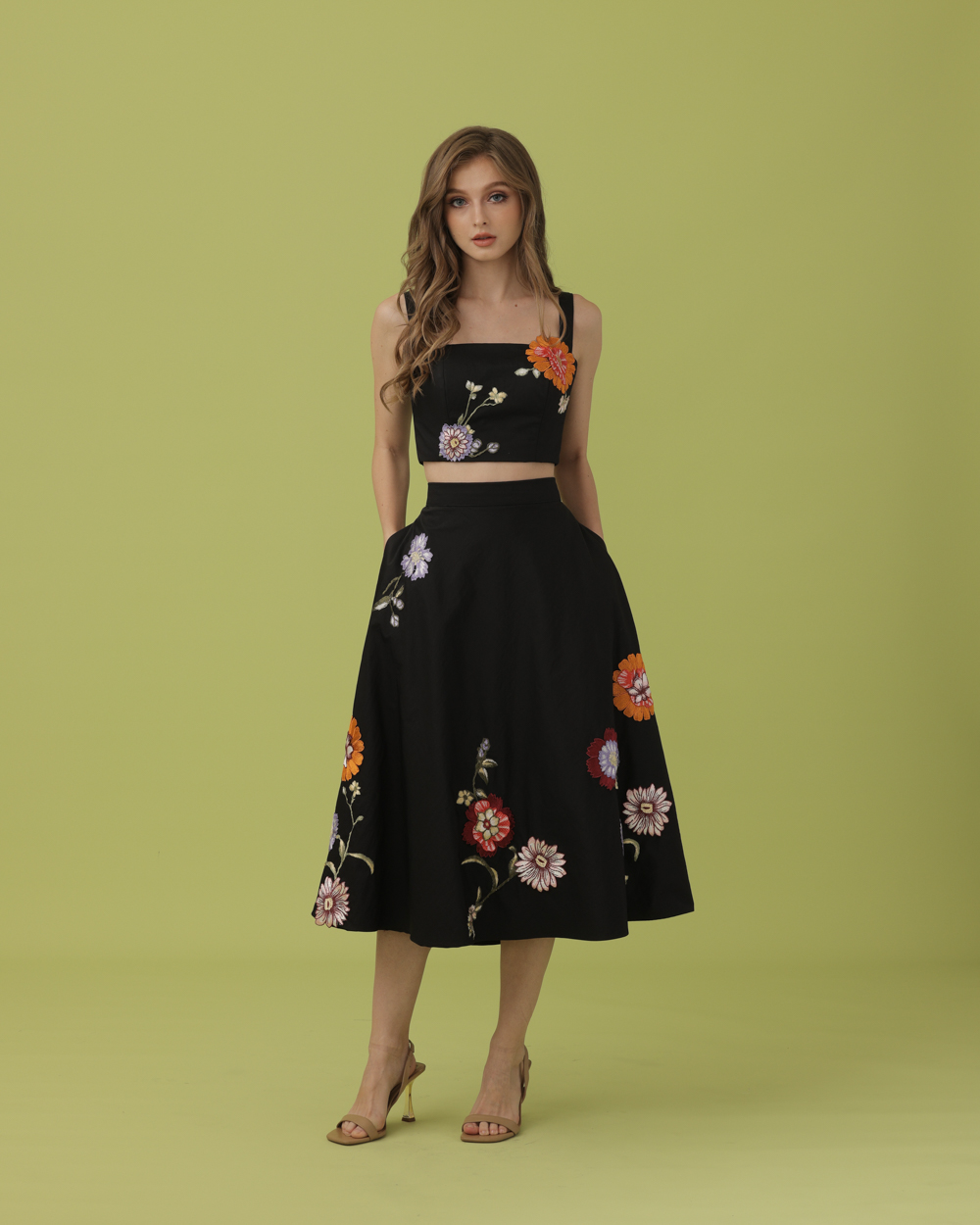 Tags: Bias cut skirt, Black, Bustier, Coordinates, Coords, Corset, Cropped top, Floral, Holiday 2023, Holiday Collection, Lace Appliques, Midi Skirt, Tube Top