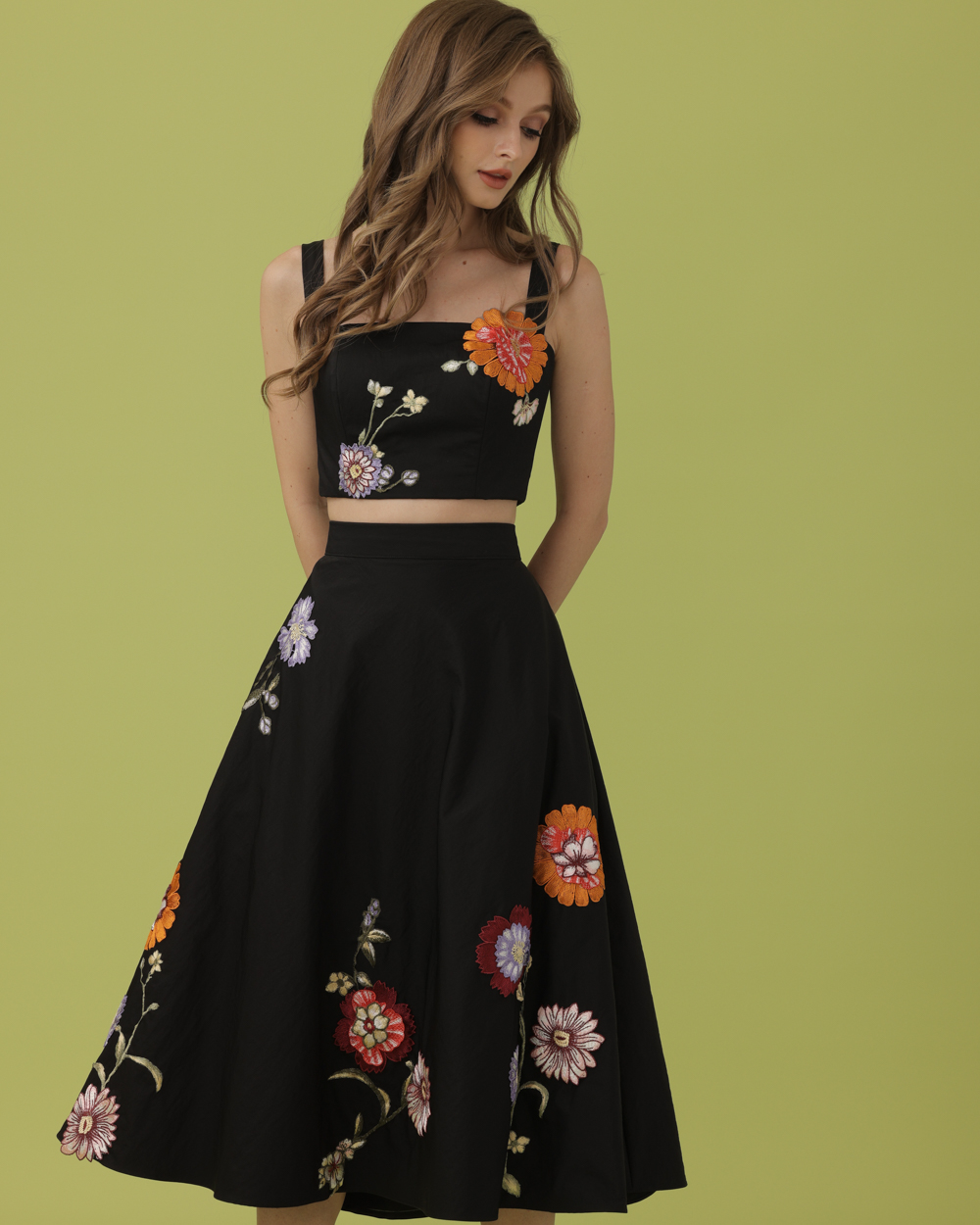 Black cropped corseted tube top with coordinated full bias cut midi skirt embellished with multi-coloured floral lace appliques